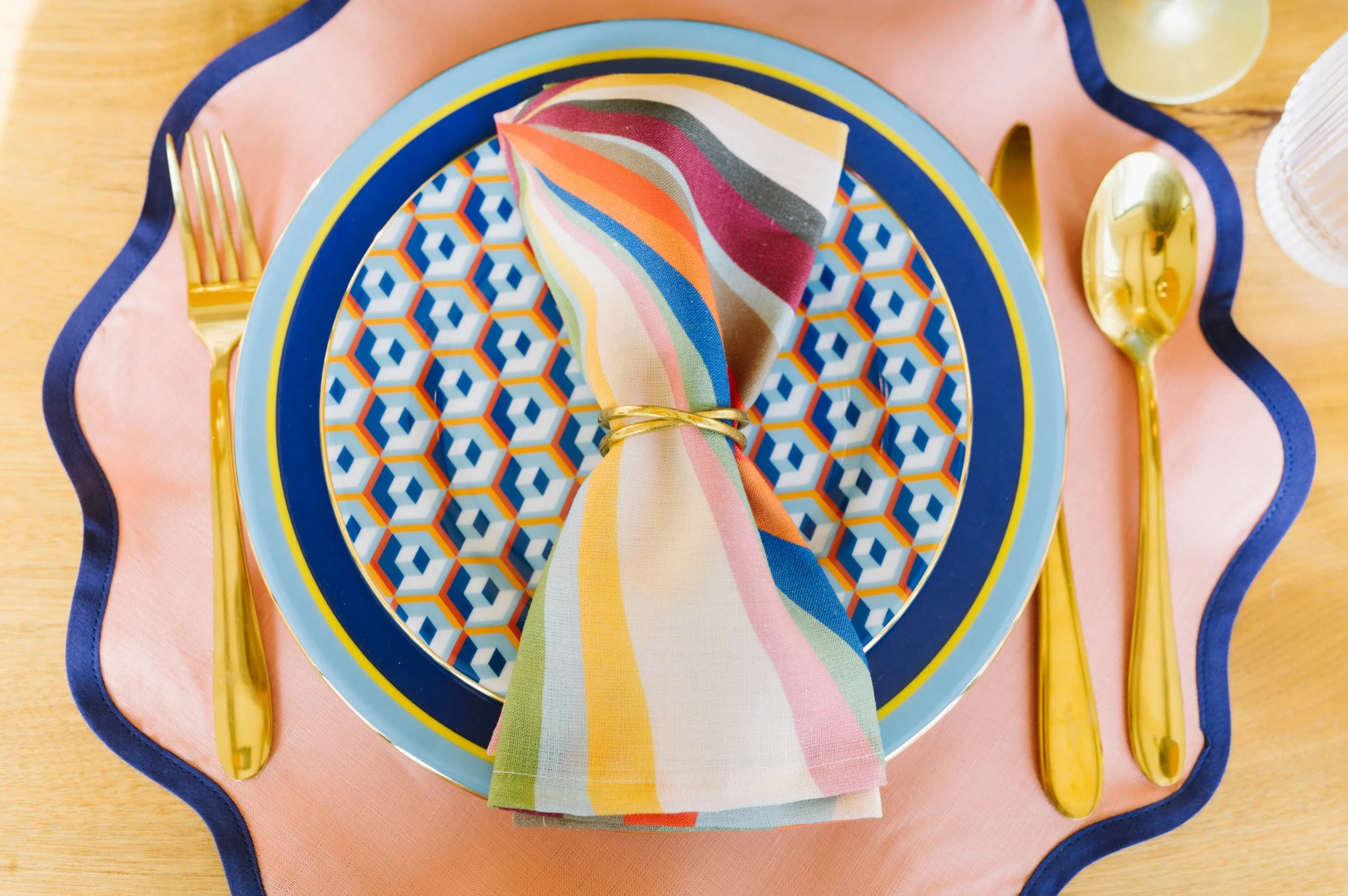 This year’s tablescape theme is full on color and print on more print! I am obsessed with this set of dinner plates and dessert plates from La Double J. Paired with these funky napkins…also from La Double J! At a lower price point, these multicolor stripe napkins from Dusen Dusen are another fun and funky favorite. I can’t recall exactly where I purchased these adorable scalloped placemats from, but I found a few similar options: here, here, and here!