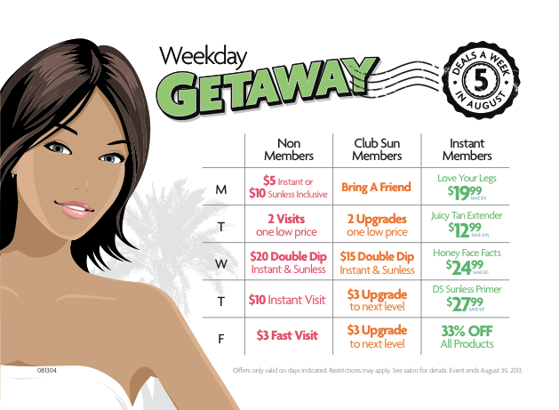 Make Every Day a Getaway at Sun Tan City this Month. There's a Special for Everyone, so let Yourself Shine! Offer Valid on Days indicated. Restrictions may apply. Event ends Aug 31, 2012.